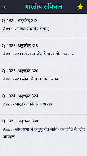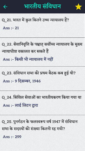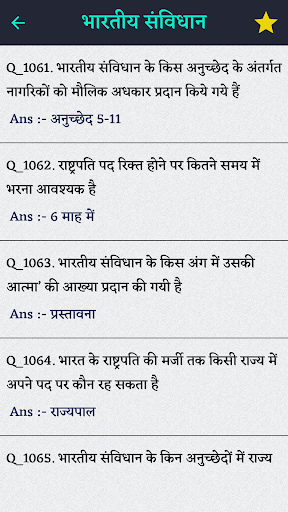 भारत के संविधान के महत्वपूर्ण प्रश्नों के लिए आप इस ऐप का सहारा ले सकते हैं। इस ऐप में आपको बहुत ही आवश्यक अनुच्छेद, राष्ट्रपति, संशोधन, उपराष्ट्रपति, भारत की संसदीय प्रणाली और भी बहुत सारे प्रश्नों का समावेश मिलेगा।