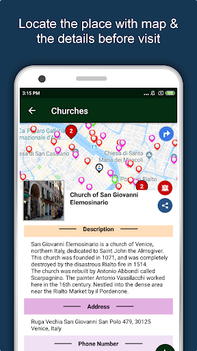 Apart from this, Venice Travel & Explore guides you Why, When and How to visit various places in Venice with precise location on the detailed Map. There are two ways to explore this app - Category view and EduBank favorite places view. Pin your destinations and get the routes on the Map. Not only this, you can see exactly how the places look like with Street View integrated in this app. The app also has a feature to Rate and write Review/Experience regarding entity(s) through Login. Your Travel experience and rating will help the user community.