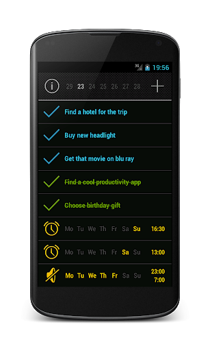 A single app that can serve as an automatic silencer, a notification tool, an alarm clock and a task manager, targeting the entire productivity cycle under a simple user interface.