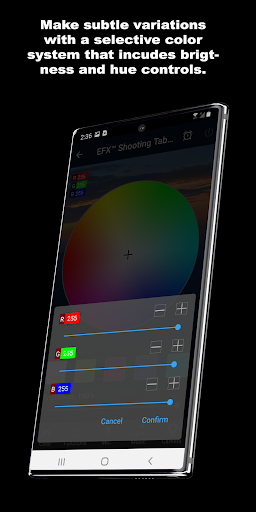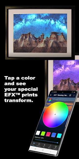 This EFX™ app allows you to control color on our special EFX™ fine art giclées or on our EFX™ printed advertisements. No longer does printed imagery have to be one dimensional, one color, and totally static in nature. With a US patented process, use our app to turn change particular object(s) to different colors our printed imagery.