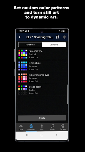 This app uses a Wi-Fi connection to communicate with an EFX™ device, which in turn allows you to control the look of your art or advertisements from anywhere in the world! Other advance features include an advanced timer, ability to choose over 16M different colors, ability to group multiple EFX™ devices together, ability to control and synchronize colors, and the ability for our special EFX™ prints to dance to the music; Just select a song off your smartphone or pull up your playlist from your favorite streaming music provider (e.g. Apple Music®, Pandora®, Spotify®).