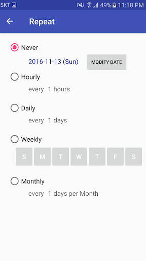 Monthly Repeat Date: Alarm at the time specified on the set date of each month.