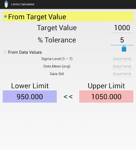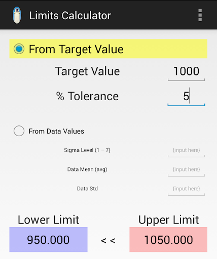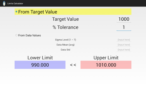 Input the target value and the % tolerance. Example for a 1 K ohm resistor at 1% tolerance , the limits will be Lower Limit = 990 ohms, Upper Limit = 1010 ohms.