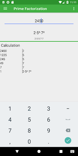 You can use this app to calculate all the prime factors of any number. Enter the number in the input and the prime factors will be calculated automatically. The app shows all the factors separate (2·2·2·7) and with powers (2³·7). The app also shows all division steps.