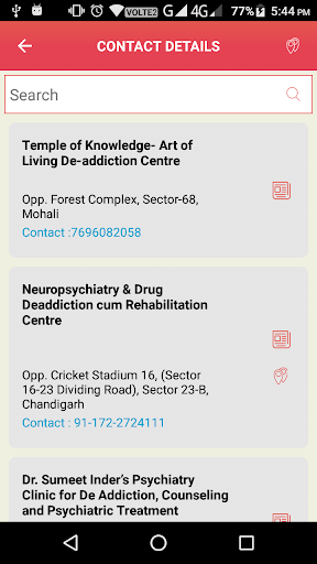 The users can also search for de-addiction centres around and get contact information for them.