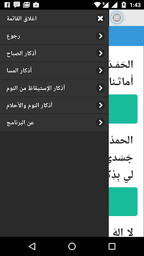 تطبيق اذكار الصباح والمسا بدون اعلانات وسهل الاستخدام يتيح لكل مسلم الرجوع اليه بكل سهولة ويسر يحتوي التطبيق علي ----------------------------------- أذكار الصباح أذكار المسا أذكار الإستيقاظ من النوم أذكار النوم والأحلام نتمني من الله قبول الثواب