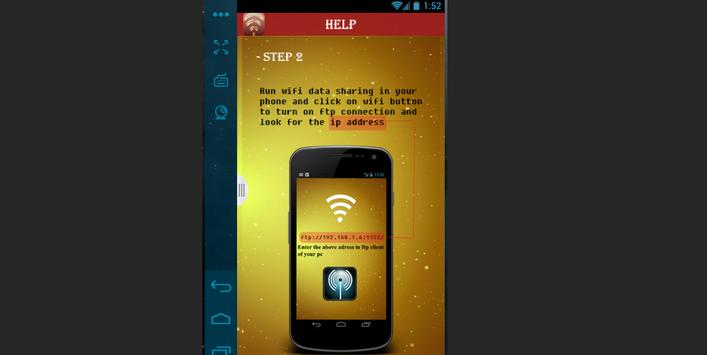 • Run the Wifi data sharing app and click the Wifi button to turn on FTP connection and look for IP Address