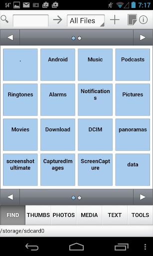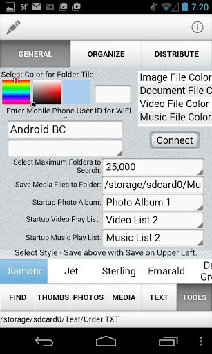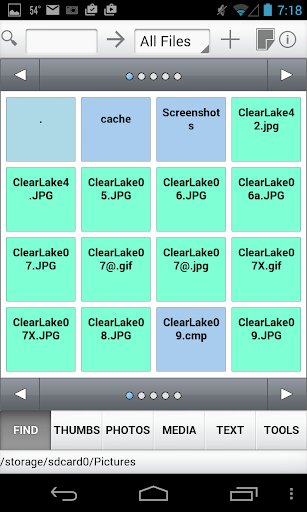 File Viewer Express is a File/Folder Explorer with additional features such as File Organization, Photo Viewing, Editing, Video and Music Player with Play Lists, Text/Document Viewer. When First running File Viewer, you are presented with a Tile List of the Visible Folders on your disk. Any Files in your root or starting folder will be listed at the end. You can navigate through the list using the dots and arrows on the top and bottom of the tile list. Clicking on a Tile will open the sub directory or folder, listing other folders and files. Files are color coded by File Type. Clicking on the following File Types will display or play the file: