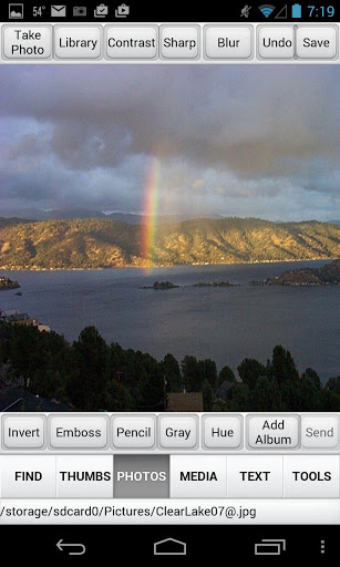 Photos can be edited using functions as Contrast, Brightness, Blur, Hue, and effects as Emboss, Pencil, Posterize, etc. Files can also be Organized by Photo Albums and Play Lists. You can combine Photo Albums and Music Play Lists on the Music Tab to create a Slide Show. Transitional Effects and display times can be set per photo. Text, Excel, DataSnap files and source HTML documents can be displayed and shared with other devices.
