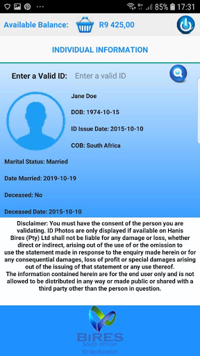 This is an South African ID Verification Android Application that provides person information regarding a specific individual. Please also note that this is a paid service and is not free, and only available for users that do volumes, this is not a once off ID verification Service.