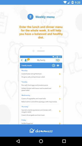 * Weekly Menu: Enter the lunch and dinner menu for the whole week. It will help you have a balanced and healthy diet.