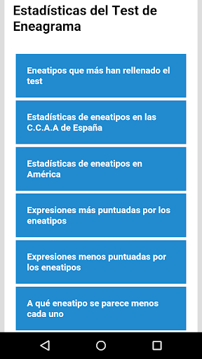 También podrás consultar diferentes estadísticas según los resultados de más de 40 000 tests: la afirmación más puntuada por cada eneatipo, comunidades autónomas de España o países de América donde hay más promedio de cada eneatipo, mapa de distribución de cada eneatipo, mapas de proporción de cada eneatipo en América o en España...