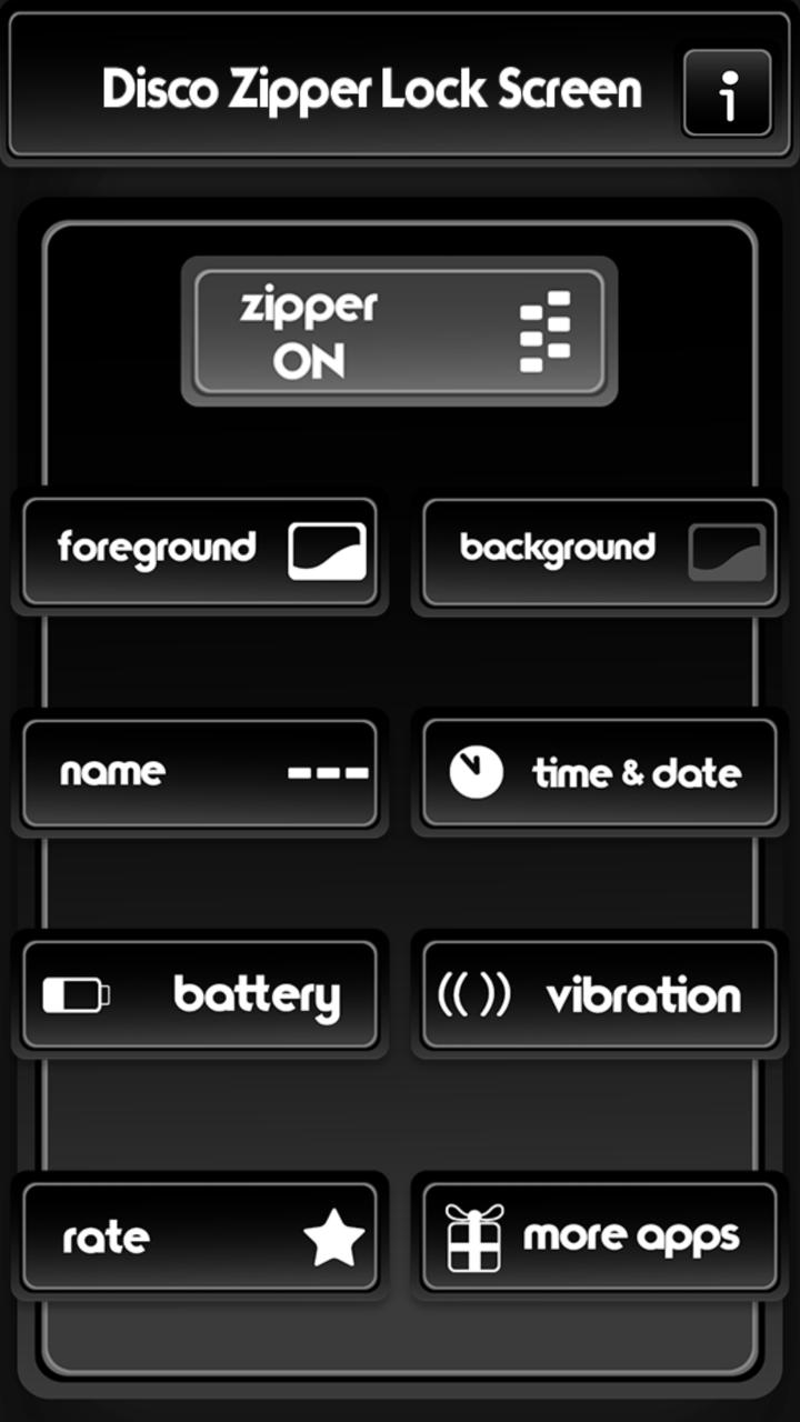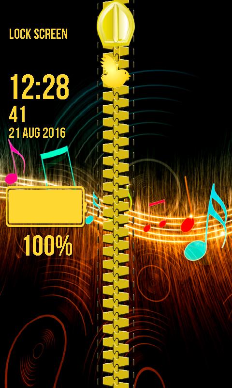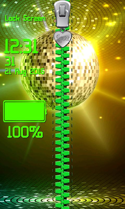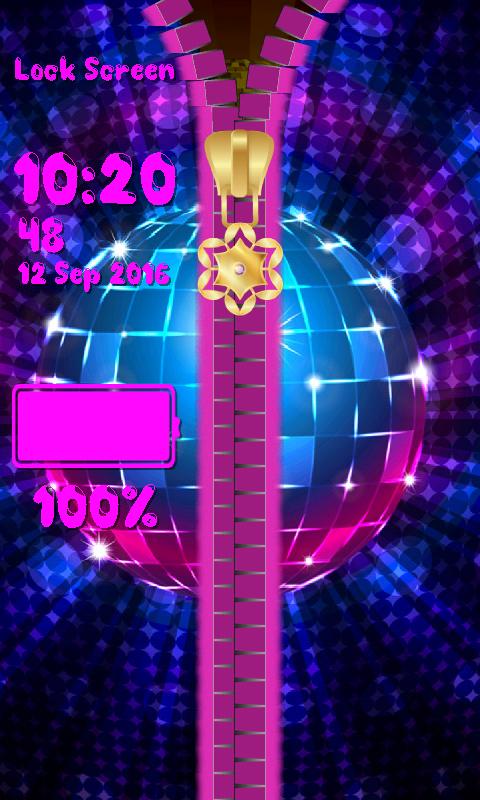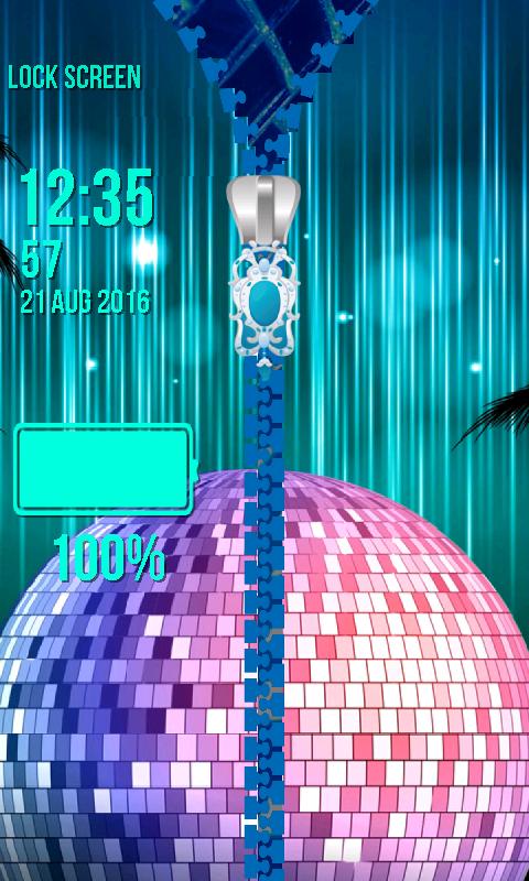 moves. Enjoy the glory while it lasts and do not wake up because then everything will fall apart like the house of cards. With the best Disco Zipper Lock Screen you will have the fantastic opportunity to become the star of the night. Do not miss it but grab it tight with both hands. Imagine that you are in the famous club bathing under the colorful neon lights and dancing. They are playing some slow music and your partner leads you into romantic dance. With the top Disco Zipper Lock Screen you will be overwhelmed with the feelings of happens and love. Whenever you feel blue just unzip the picture to unlock your smartphone and observe the amazing background of shining musical notes. They will cheer you up in a blink of an eye. With the popular zipper locker for screen you can adjust the color and font of time and date but before you apply it check whether it suits your foreground with one single tap on the preview button. Do not forget that you can also change the style of the hook and embellish the chain with the sensational red heart. Get the coolest Disco Zipper Lock Screen and it will turn your phone into a machine that will take you to a land of your dreams while you browse the latest photos. Imagine the glittering ball whirling on the ceiling and you dancing on the floor like a star.