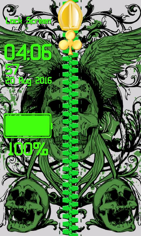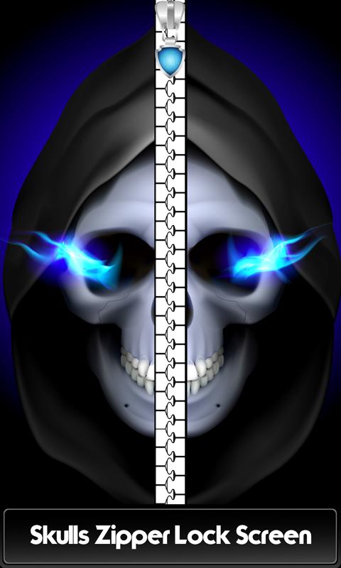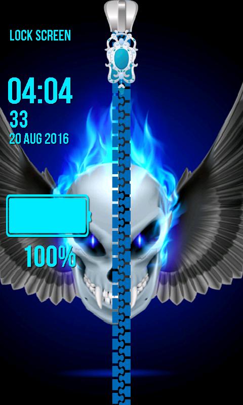 Get the latest photos that will enhance your phone in the best possible way. Download free the newest Skulls Zipper Lock Screen app and enjoy the amazing pictures any time you wish. Look at the stone wall in front of you. There is an old wooden chair that resembles the throne. The scariest skeleton wearing cloak and wielding-scythe smiles to you and you are terrified. Unzip this eerie picture to unlock your smartphone and explore the coolest features of the top Skulls Zipper Lock Screen. Imagine the head without flesh burning on blazing fire. Enter your name and adjust its color to suit the photo that you have set as your foreground. Tap preview button to see whether you like it. The other one has the loveliest wings you have ever seen. You are horrified because it is stabbed with the powerful sword. With the popular Skulls Zipper Lock Screen you will be startled with the picture presenting three the scariest heads. They belong to the ghosts that are still roaming and that cannot find their resting place. Their look hunts you in your dreams. Change the font and of time and date and make sure that it will embellish wonderfully your phone. Get the coolest zipper locker for screen and be amazed with the silver head of the skeleton with lovely fangs and the cutest wings. Blue flames cover its top while the eyes are glowing. Do not forget that you can change the hook and pick one from the latest collection we have created for you. The red heart will surely catch your attention. Get the newest Skulls Zipper Lock Screen and share the amazing photo of the skeleton. There is the scariest head right in the middle of the chest.