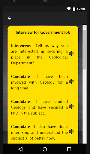 This application contains step by step training on English Interviews. There are several lessons like HR Round interview, Manager Round Interview, Typical Interview Questions, Tricky Questions, Private Job Interview, Government Job Interview and Tips and Tricks for successfully qualifying in interviews. This is a very methodical app and will help you succeed in English Interviews. Follow the suggestions in the application and you can make maximum benefit out of it!