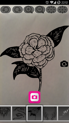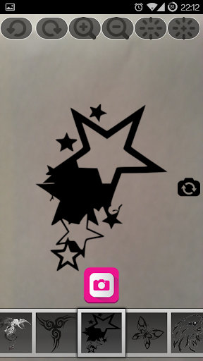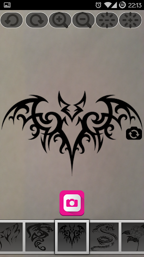 You can switch between the frond and back camera to make pictures. Also you can shrink and enlarge the tattoo designs to fit them on your body.