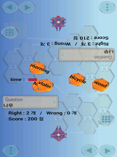 (1) 우주선게임 : 문제에 제시된 영어단어를 미사일로 맞추는 게임이다. 1인 플레이 뿐만아니라 2명이서 같이 게임을 할 수 있다. 매번 게임을 할 때마다 제시되는 문제가 달라서 지속적으로 할 수 있다. 게임의 요소를 활용해서 재미있게 영어단어를 학습할 수 있다.(우주선 및 시간선택 기능.)( 학습 수준 선택가능)