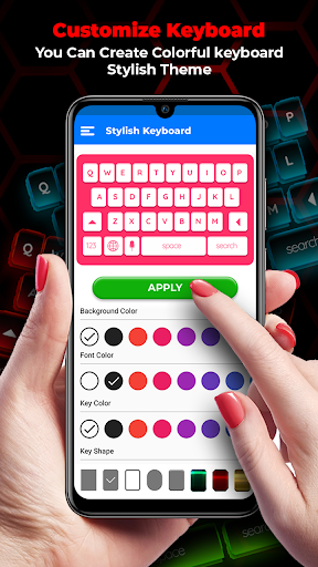 chat and text message. This unique keyboard app has all the latest designs keyboard theme in your mind and you want. This new keyboard theme app have fancy keyboard backgrounds and multicolor text and key shape. You can create colorful keyboard stylish theme. You can add photo to keyboard backgrounds and make keyboard themes free for android. Now it is very easy to change keyboard theme like cool colour keyboard for you.
