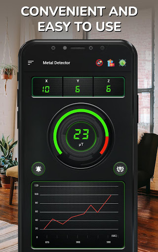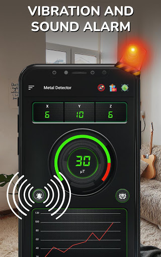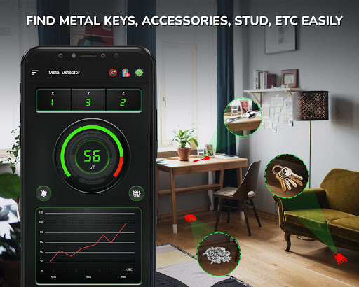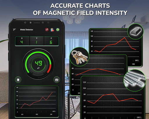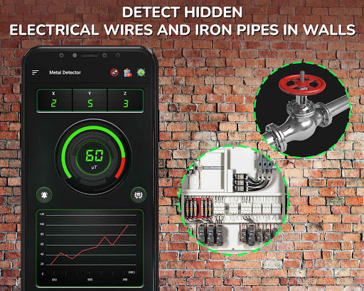 👉👉 Open Metal Scanner - Stud Finder app on your cell phone and move it around. You will see that the magnetic field level shown on screen is constantly fluctuating. Colorful lines represent the three dimensions and the numbers on top show the value of magnetic field level (EMF). So that you can find metal keys, accessories, stud, hidden electrical wires and iron pipes in walls easily with Stud Finder - Sensor Detector . The chart will increase and the app will make sounds announcing that metal is close.