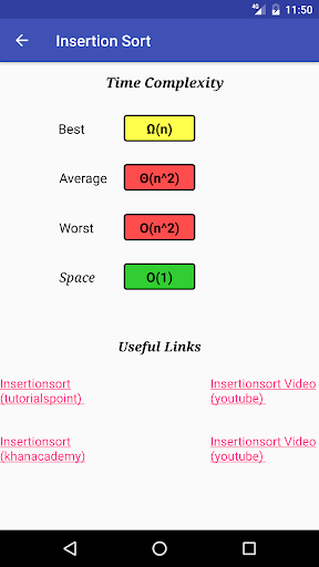 - All data structures and sorting algorithms include useful links to websites or videos that will help user's gain a deeper understanding of the topic. Some websites include Khan Academy and Tutorials Point.