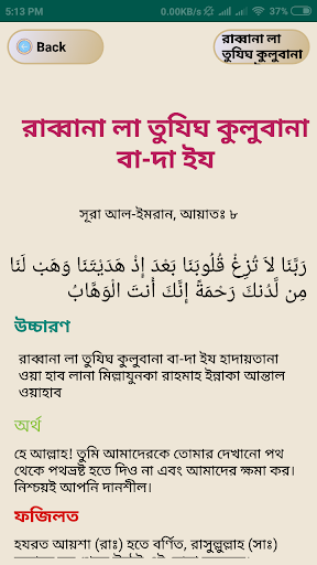 All 40 of the Duas are in Arabic and also in bangla for you to recite them in the correct pronunciation, so it also helps you learn Arabic if you hadn't known already.