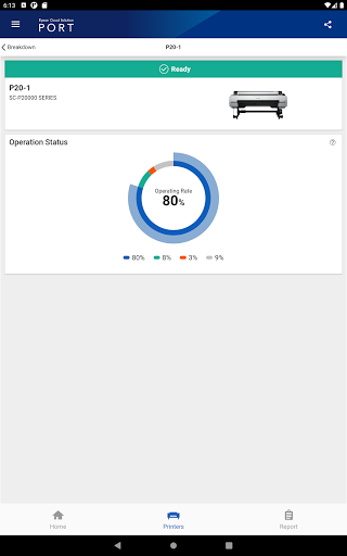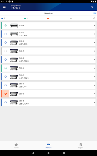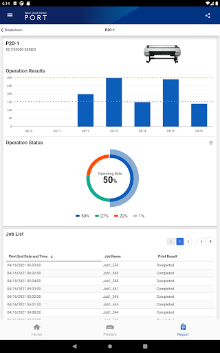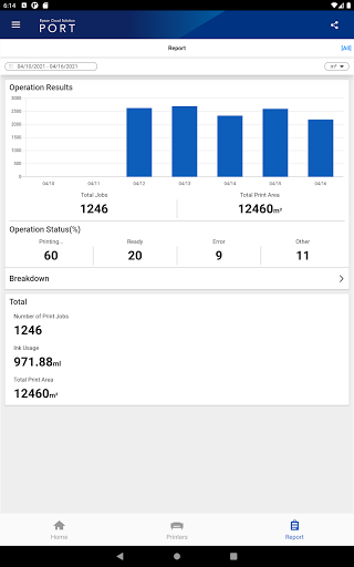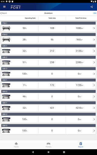 You can see the number of printed jobs, printed area, printer operation rate and also know if there is an error in real time. And 'Report' feature can summarize these data for a specified time period and display graphically and you can also see the breakdown by each printer.