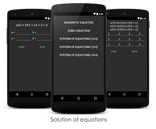 This application also can solve linear equations, quadratic equations cubic equations and systems of equations: a system of two, three and four equations. The complex numbers is supported in a solution of quadratic equations and cubic equations.