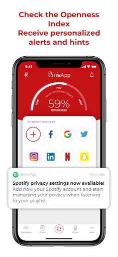 ErnieApp will never do anything on your behalf without a direct action performed by you. Remember to regularly open the app, watch your privacy settings and use the ErnieApp privacy meter as an ‘alert’.