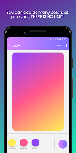 Gradi allows you to create your gradient wallpaper using your desired colors, up to 20 to inspire your creativity. Customize your creations by choosing between the three gradient types available: Linear, Radial, and Sweep. ❤️🎨🟣🟠🟡