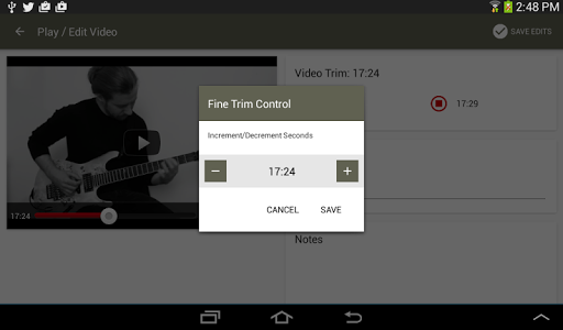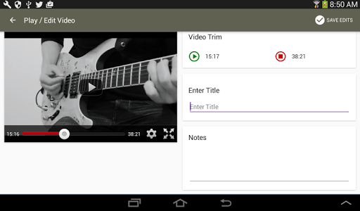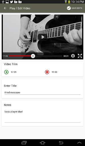 Each clip in the library can be watched by clicking the video thumbnail. When in video viewing mode, click the Edit button in the upper right and Riff Grabber will enable you to trim the video, with start and stop points, to play only the segment you’re interested in learning.