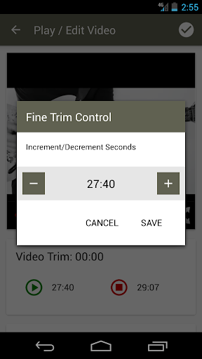 Precisely set video in and out points, giving you exact control where the video will start or stop. When you are in edit mode, press and hold one of the video trim buttons. This will open a dialog window where you can finely adjust the start or stop point one second at a time.