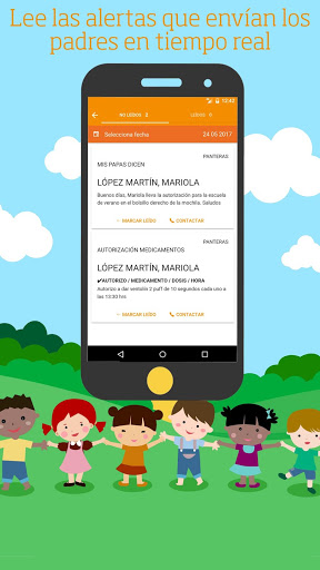 - Recibe notificaciones push de cualquier evento que quieran comunicar los padres (alertas, mensajería).