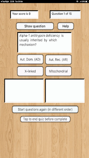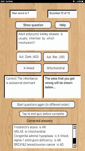 After taking the quiz, a score is awarded & the correct answers are listed for each question that was answered incorrectly. Due to the overlap between X-linked recessive and X-linked dominant modes, these conditions are classed together in the app as "X-linked", as in many current reference sources.