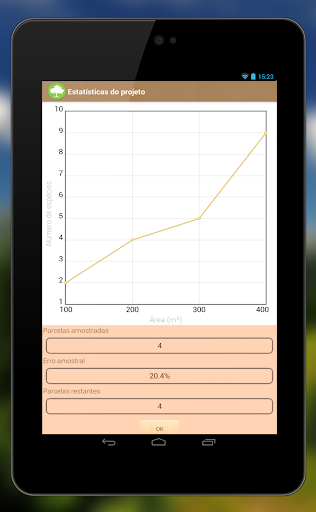 Você também poderá selecionar o erro amostral tolerável para seu projeto e, assim, Forest Files irá estimar o número de parcelas restantes a serem amostradas. Forest Files ainda permite que você visualize o gráfico de espécies x área durante a coleta.