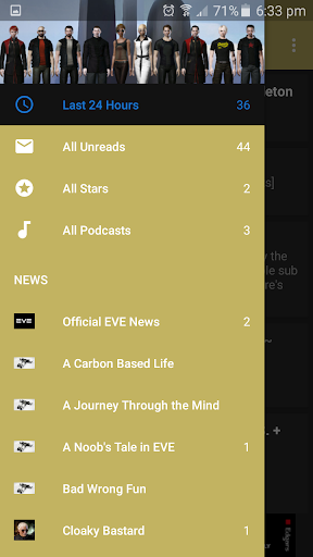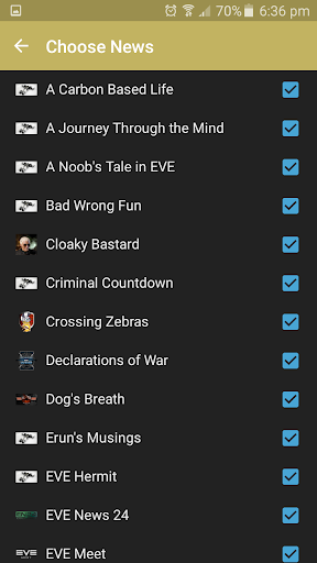 This application will develop with time and as new and interesting news sources become available they will be added to the application, if you have a news feed or blog or podcast on EVE Online and would like to have it featured on the application then please contact the developer via the email link at the bottom.