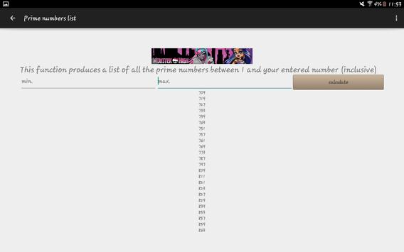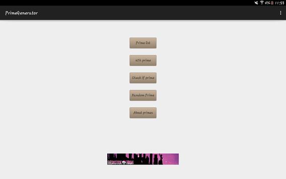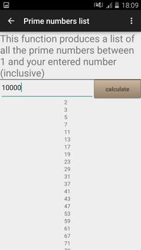 The prime number generator-function produces a list of all the numbers up to a given number of your choice. For really big numbers, this is quite a work intensive task, but it doesn't run on the main thread, so even though it takes a couple of seconds to calculate tens of thousands of prime numbers, it doesn't crash like many other apps of this kind.