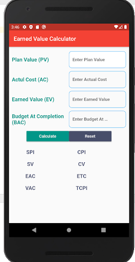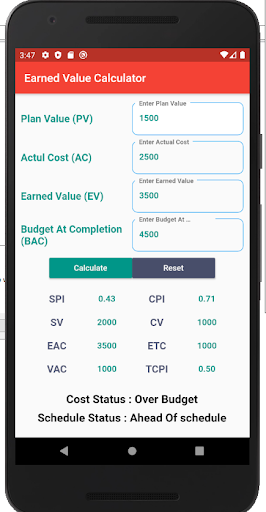 Calculator for earned value management to calculate cost status and schedule status for the ongoing project in one page with an analysis for project situation.