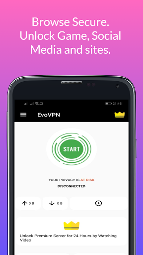 Evo VPN is a free and unlimited VPN (Virtual Private Network) proxy for Android devices. Evo VPN masks your IP address, encrypt your internet traffic, turns public Wi-Fi into a private network, and helps unblock sites and apps on your Android phone so that you can access any restricted content safely and anonymously.