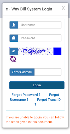 e - Way Bill System Login. Refresh. Enter Captcha. Forgot Password ? Forgot Username ? Forgot Trans ID ? If you are unable to Login