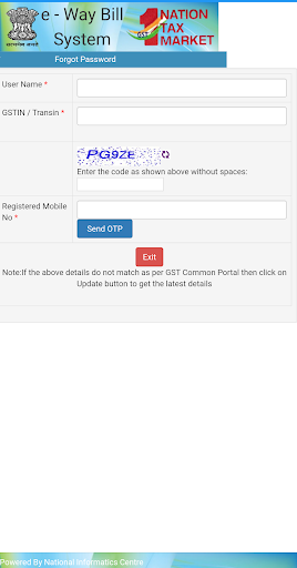 E-Way Bill Registration Form. Enter GSTIN, Please enter valid GSTIN number! Enter the code as shown above. Exit. Powered By National Informatics Centre.