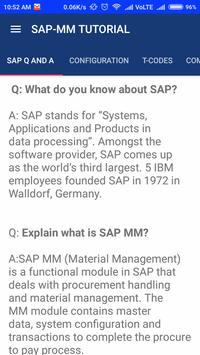This app contains t-codes,short notes,interview question and answers ,configurations e.t.c. This is a tutorial based app.It contains basic knowledge of SAP-MM.