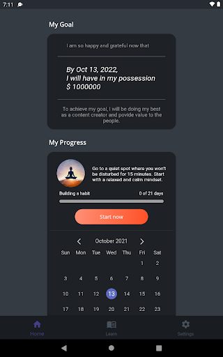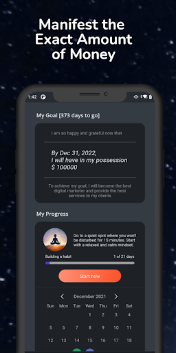 This law of attraction wealth manifestation app requires you to enter the exact amount of money you want to achieve by a certain time. Here is how to use it: