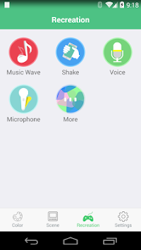 3、 Recreation interface is divided into: Yuet, voice control, shake, move wheat, Yuet function when the music starts playing lights will follow the rhythm of the music changes color, shake function with just shake the phone to believe that you know The voice control function supports voice lights, lights, color, etc., wheat dynamic function automatically detects the handset microphone when you speak to sing lights will change color depending on your speaker volume;