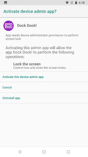 This app uses the Device Administrator permission. This permission (AKA BIND_DEVICE_ADMIN permission) is required in order to enable Dock Dock! to replace system sleep by Dock Dock! sleep, to automatically restart Dock dock! whenever set by the user in the app's settings and to optimize battery life. This permission can easily be revoked in the app's settings.