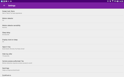 When Dock Dock! is activated, the screen turns black, and displays a minimalist clock. Optionnal motion detection opens a tray enabling direct and instant access to your most used apps.