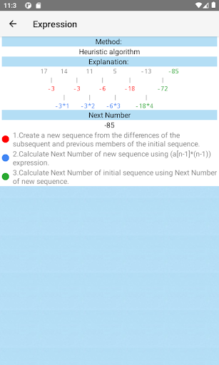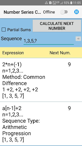 In addition to the next and missing items of the sequence, the application determines its type and formula (pattern).