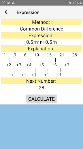 This app not only calculates the missing numbers and letters of the sequence, but also finds the formula and in some cases, the name of the sequence (Fibonacci Series, Arithmetic Progression, Geometric Progression, Prime Numbers etc) . You can also see a graphical representation of the sequence or your own function.