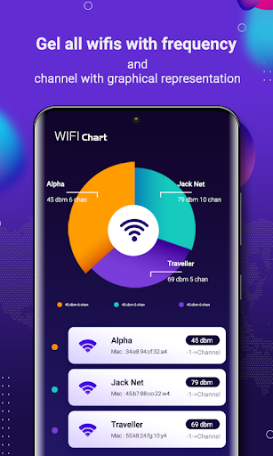 - Graphical representation view of all nearest WiFi with its signal strength and channel info