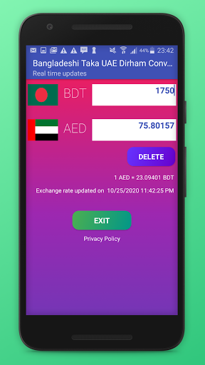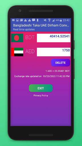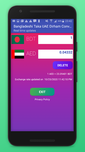 এই অ্যাপ্লিকেশনটি গুগল ফিনান্স ওয়েবসাইটে সর্বশেষ বিনিময় বিনিময় সাথে সংযুক্ত আরব আমিরাত দিরহাম এবং বাংলাদেশি করে করে. বিনিময় হার / মুদ্রার হার স্বয়ংক্রিয়ভাবে রিয়েল-টাইম আপডেট হয় হয়