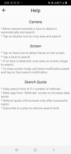 : Start screen mode and tap on face icon to detect faces on the screen. Select a face to search or tap on close icon to search again. If no faces are detected, you can crop the screen image to search specific part of the image.